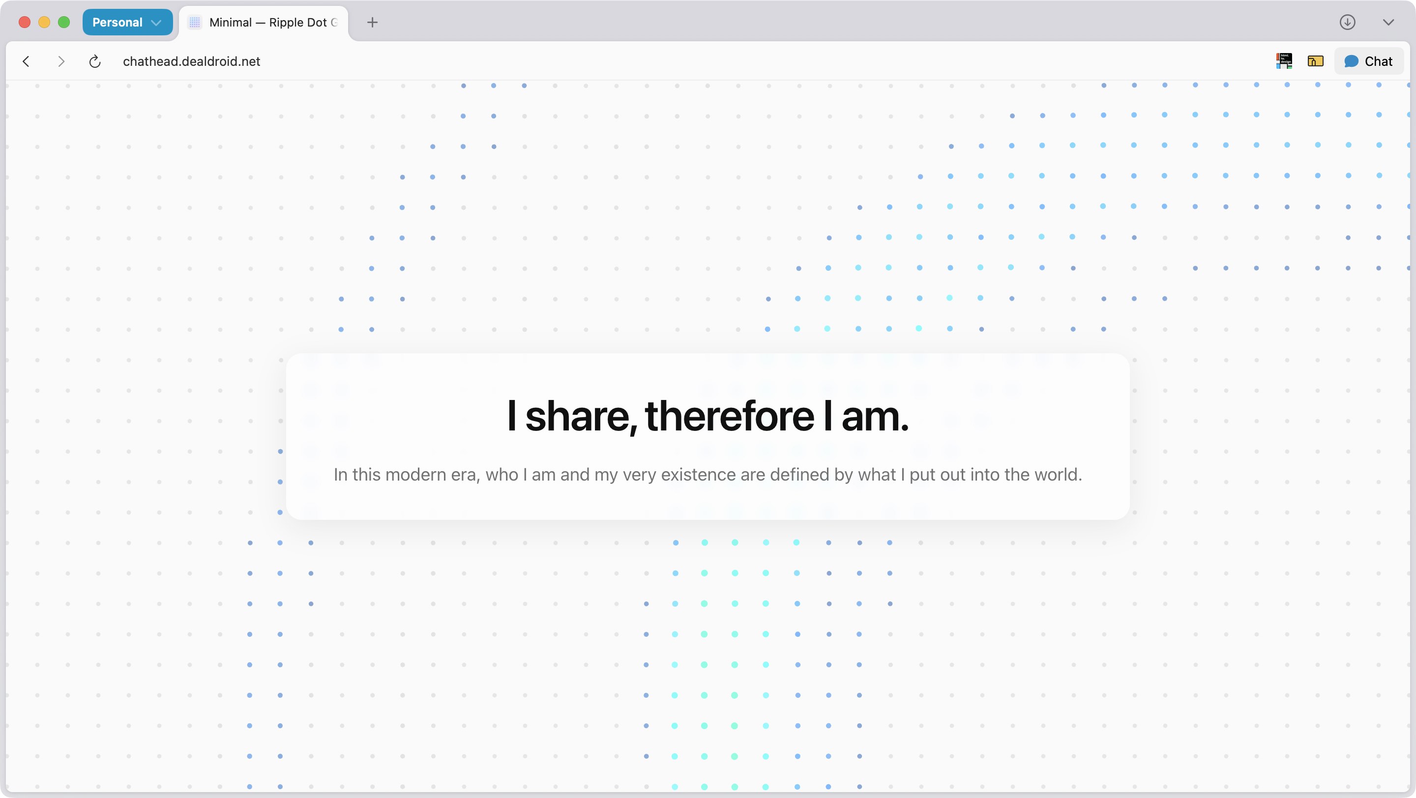 A reflection on modern existence and identity through sharing. "I share, therefore I am."
