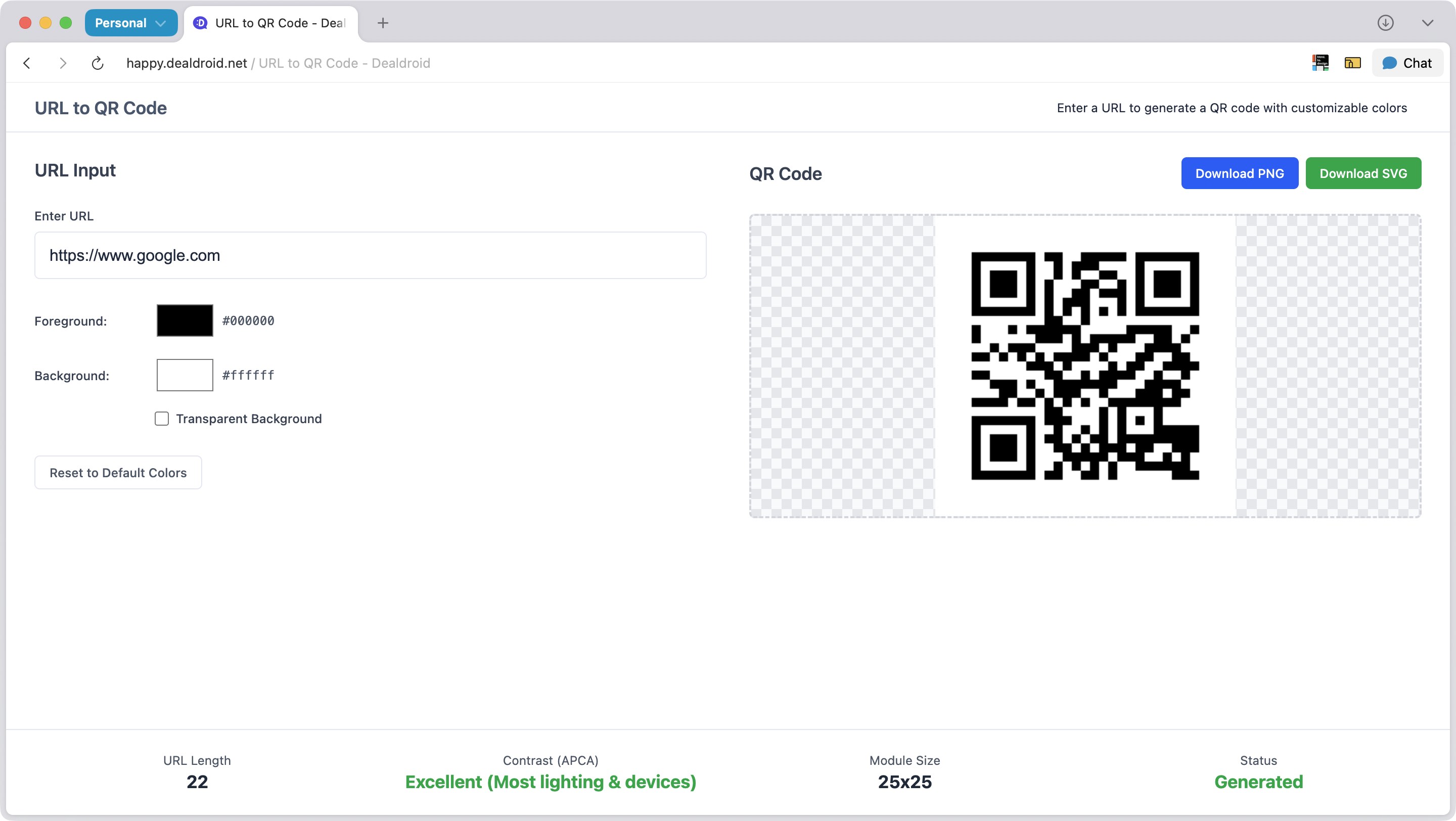 A simple tool to generate QR codes from URLs with customizable foreground and background colors. Download as PNG or SVG.